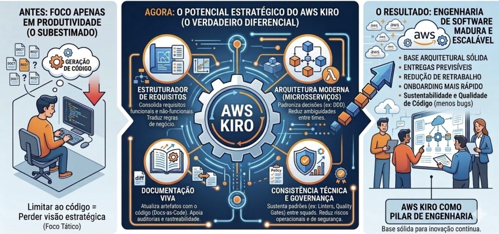O diferencial não está apenas na tecnologia, mas na forma como ela é incorporada à estratégia da empresa. Quando integrado a práticas de governança, revisão arquitetural e padrões de cloud, o AWS Kiro se torna um habilitador de maturidade técnica.